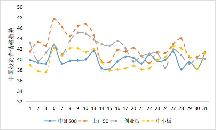 各大板块单日情绪指数显示,2021年12月各大板块情绪指数整月表现震荡走势,上证50投资者情绪指数整体处于较高水平,中小板投资者情绪指数低于其他板块。本月各个板块投资者情绪指数大致在36-48之间窄幅震荡,振幅区间较大(图6)。