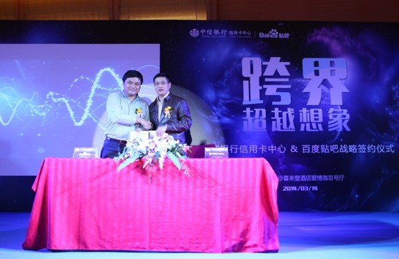 中信银行信用卡中心与百度贴吧举行了战略框架协议签约仪式,宣布双方将整合优质资源展开跨界合作,联合推出国内首个金融机构粉丝互动贴吧。此次战略协议的签署,使得百度公司与金融机构的合作更加紧密,也意味着中信银行信用卡中心完成了与国内互联网巨头百度的互联网金融平台布局。