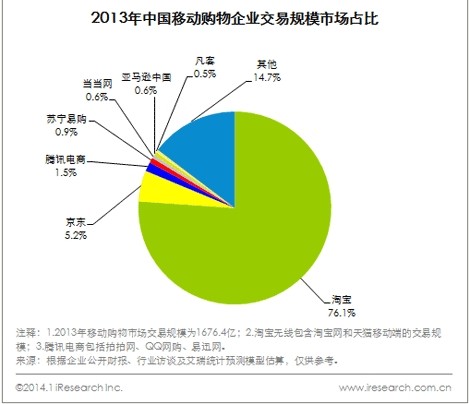 下面这张图表,来自艾瑞咨询提供的2013年中国移动购物企业交易规模市场占比的分布数据:
