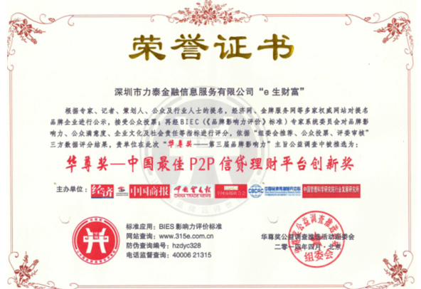 众所周之,风险控制是稳健发展的重中之重。e生财富风控部门与第三方担保机构金晟朗担保公司采取双重审核模式,从贷前审核、贷中审查和贷后管理入手,一起建立了一套严谨完善的风险管理体系,以控制借款逾期违约的风险,为投资者的切身权益提供了强大的保障。凭借一直以来的稳健务实,e生财富在诸多互联网金融服务企业中突出重围,一举拿下“华尊奖”—中国最佳P2P信贷理财平台创新奖的殊荣。