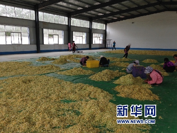 在种植基地加工产,工人们正在处理刚采收入厂的金银花