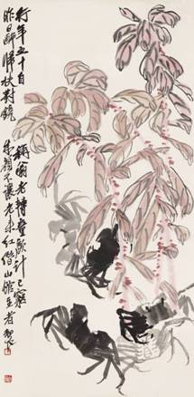 在创作上受到吴昌硕启发,最终实现衰年变法的齐白石,亦有画作呈现于此次春拍。《富贵坚固》将艳红牡丹与耸立山石共置一画,灿烂柔美与坚固永恒的组合,直白地表达了画家对美好生活朴素的情感。齐白石《朱颜不让老来红》则展现画家“衰年变法”之成功,传达出白石老人旺盛的创造力及乐观精神。