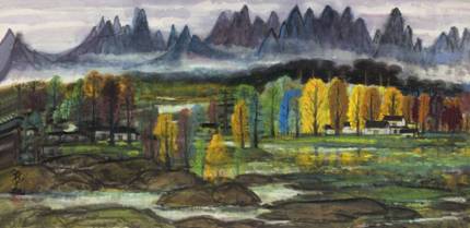 与《梅妻鹤子图》相对应,同为本场重点拍品的《坐爱枫林晚》则是一件林风眠先生艺术成熟期的典型之作。此作中,远山不施重彩,因而富于中国传统水墨情趣;中景树木则以鲜艳而跳跃的色彩施染,以青、绿、黄作为主色调,既有传统青绿山水之韵味,又有水墨之意境;近景石头的描绘又有如塞尚之笔法,以浓黑的墨线勾勒出轮廓 ……整幅画面远、近景沉着而静逸,中景热烈而活泼。如此景物错落有致,并非以客观、科学的透视法则为准,而是基于画家主观的感觉,可见表现主义的影响。大师手笔构建的和谐景象,令人赞叹!