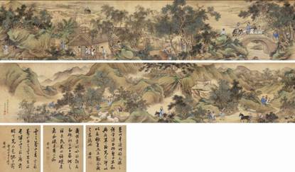 清代画家杜蘅所绘手卷《游春图》兼工带写,恬静悠远,图中山村、丘陵奇峻,草木丰茂,具有节奏感。山石层层叠叠,皴法细腻,勾勒细致,并以金碧青绿之色染之,设色典雅清丽。又有河流穿插其间,山水交映,堪称难得之青绿山水佳作。