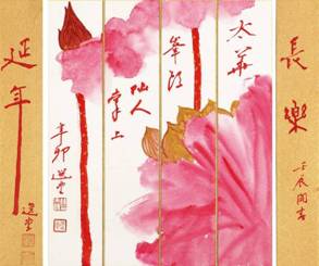 国学大师、西泠印社社长饶宗颐先生,所绘《红荷》出尘高洁,具有文人画的味道。饶老以篆隶之笔勾花,以草书之法绘叶,又以朱砂设色于泥金纸上,别具一番风味,又有长乐延年之美意。据知,饶宗颐先生曾将同题材画作《荷花图》赠与温家宝,以此赞赏其高洁如莲,风雨不倒之品格。温家宝接受此礼物感言:“您很了解我,我就是风雨不倒,我就是有一个不屈的灵魂。”由此可见此作之重要意义所在。