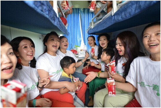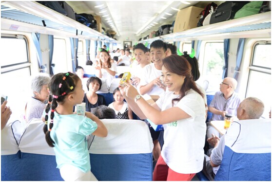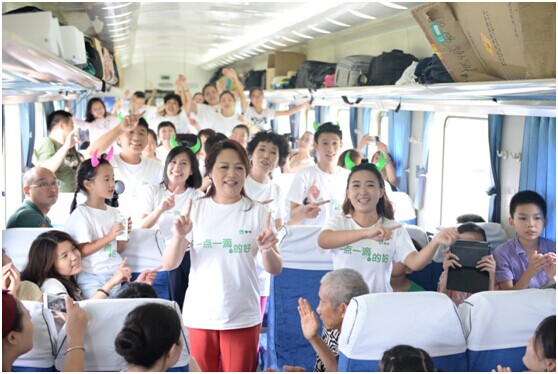 7月29日,K113次列车像往常一样按时驶出成都古城,开往四季如春的昆明,车厢内的乘客沉浸在自己的世界中,或看手机,玩游戏,或是睡觉,聊天。伴随着一声稚嫩的童音,车厢的平静被打破,“我和我的祖国,一刻也不能分割…”传来,蒙牛乳业总裁孙伊萍、“中国?谷?乐唱团”成员以及蒙牛员工一起走进车厢,开启了蒙牛“一点一滴”公益快闪活动。