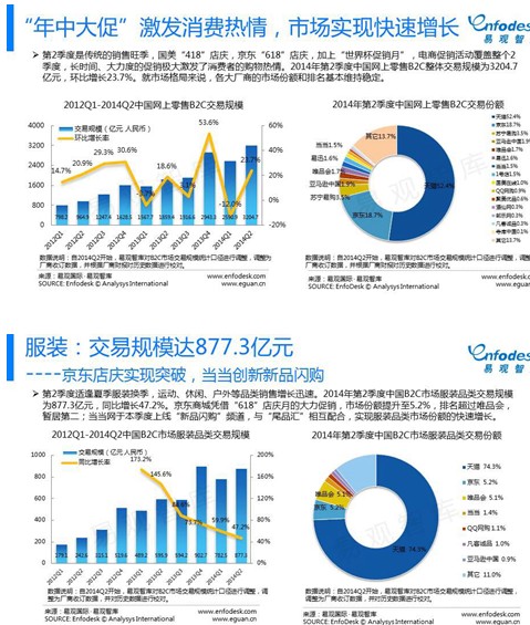 2014年第二季度中国网上零售B2C整体交易规模为3204.7亿元,中国B2C市场服装品类交易规模为877.3亿元,同比增长47.2%。