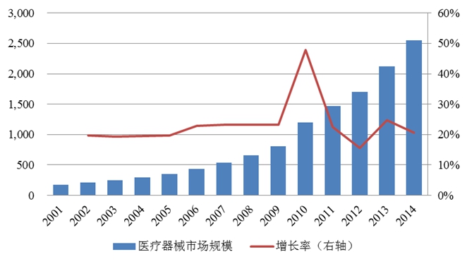 2001年至2014年我国医疗器械市场规模情况
