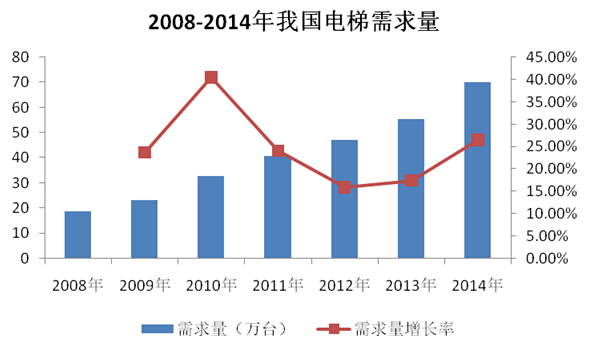 随着我国经济持续增长、城镇化建设的加速、人口的老龄化、建筑行业的进一步发展、现有电梯的不断更新改造、既有旧楼加装电梯的大量需求,电梯市场需求量未来若干年内仍将快速增长。我国在今后相当长的时间内也仍将是全球最大的电梯生产基地和消费市场。