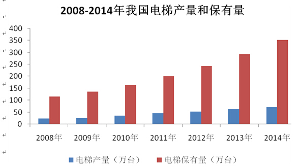 我国电梯行业历经30年的发展,已成为现代社会发展必不可少的重要建筑设备,对于改善人民生活品质,提高生活质量,实现我国建筑业“节能省地”的国策起到了不可替代的支撑作用;同时电梯又因其功能与广大人民群众安全与生活质量息息相关,多年来一直被国家列为特种设备。近年来,在房地产、轨道交通建设、机场改建扩建等的强劲带动下,我国电梯产业快速发展,成为我国装备制造业一颗璀璨的明珠。目前我国已成为全球最大的电梯生产国和消费国,据统计2013年我国电梯年需求量已超过45万台,占全球电梯市场需求量的60%。截止到2014年,电梯生产量达到70.8万台,电梯保有量已突破350万台,预计到2015年电梯保有量将达到420万台。我国近几年的电梯需求量、产量和保有量如下图所示: