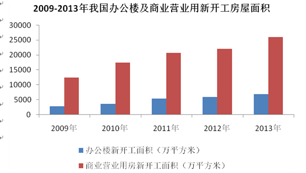随着国内第三产业规模的不断扩大,我国办公楼及商业营业用房需求持续增长。2009年我国办公楼及商业营业用房新开工房屋面积分别为2,860.76万平方米和12,415.03万平方米,到2013年上述两类用房新开工房屋面积分别达到6,887.24万平方米和25,902.00万平方米,复合年增长率分别达到24.56%和20.18%,均保持较快增长。