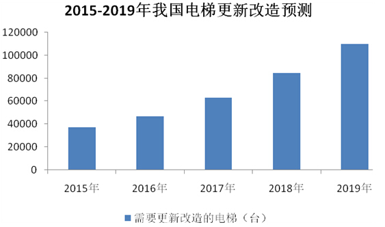 在旧电梯更新领域,电梯超过规定使用年限仍违章运行,将带来电梯安全方面的重大隐患。根据国务院公布的《特种设备安全监察条例》的规定,“特种设备存在严重事故隐患,无改造、维修价值,或者超过安全技术规范规定使用年限,特种设备使用单位应当及时予以报废”。根据中国电梯协会、《全国电梯行业商务年鉴》数据以及电梯使用15年强制报废的行业规定计算,2015-2019年我国电梯更新改造量预测如下: