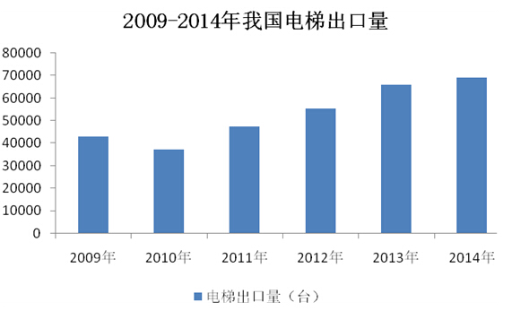 近年来,随着国内企业加大对于高端电梯产品的研发和在关键技术上的突破,电梯进口数量逐渐降低。同时,国内电梯产品技术、质量逐步提升,凭借相对较低的生产成本在国际市场上竞争力逐步凸显,民族电梯品牌在海外市场逐渐被认可,并形成大量产品出口。2009-2014年我国电梯的出口情况如下: