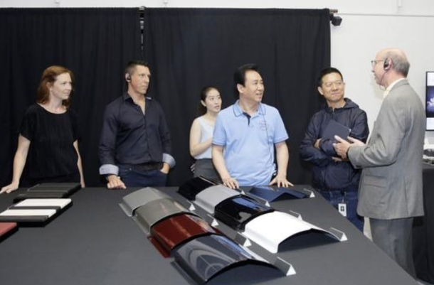 FF全球高级产品副总裁Nick Sampson(原特斯拉model S研发负责人,右一)与FF设计负责人Ron Polonski(原特斯拉和福特汽车设计师,左二)向许家印介绍FF产品内外饰材质和设计理念;
