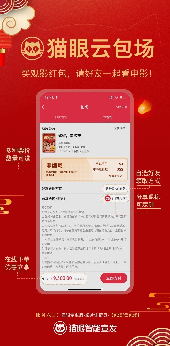 2月9日,猫眼业界首创推出智能宣发“云包场”产品,为就地过年的影迷们解锁了无接触式的“包场”新玩法,也为疫情新常态下的电影宣发提供了新思路。该服务通过在线下单购买指定观影票券、并借助微信生态以群发或单发的形式快速触达用户,方便不同地点的人群参与到观影活动中。