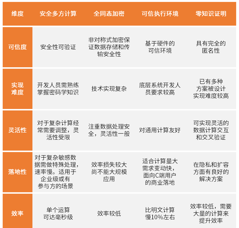 报告围绕链上隐私主流技术路径展开,将几种主要技术路径做了对比。