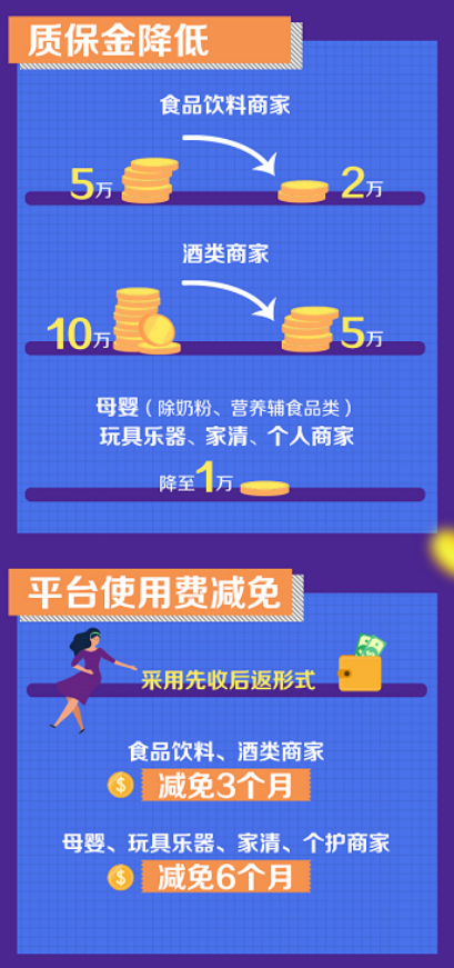 在降低商家运营成本方面,为降低商家资金占用,京东超市推出“质保金降低”政策。食品饮料商家质保金从5万降至2万,酒类商家质保金从10万降至5万,而母婴(除奶粉、营养辅食品类)、玩具乐器、家清、个护商家质保金仅需1万。