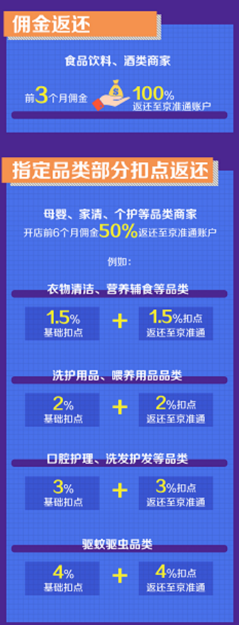 而对于母婴、家清、个护等品类商家,开店前6个月佣金可享50%返还至京准通账户。其中,衣物清洁、营养辅食等品类采取1.5%基础扣点、1.5%返还至京准通,洗护用品、喂养用品品类采取2%基础扣点、2%返还至京准通,口腔护理、洗发护法等品类采取3%基础扣点、3%返还至京准通,驱蚊驱虫品类采取4%基础扣点、4%返还至京准通。