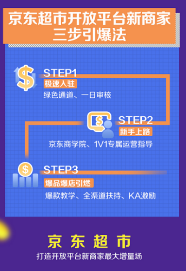 京东零售非食品事业部非食品POP部总经理贾毛毛表示: 在新商家入驻之后,他们还会帮助新商家快速成长。京东超市针对新商家还有“三步引爆法”:绿色通道、一日审核的极速入驻;京东商学院、1V1专属运营指导;包含爆款教学、全渠道扶持、KA激励的爆品爆店引燃;三步助力入驻新商家快速爆发。