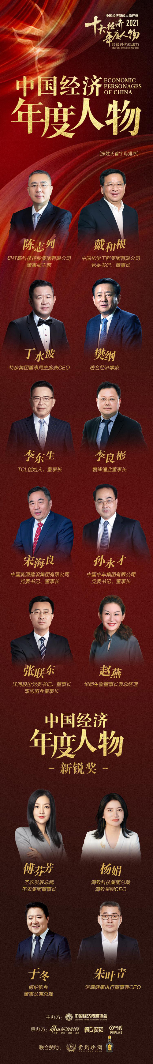 中国能源建设集团有限公司党委书记、董事长宋海良;洋河股份党委书记、董事长,双沟酒业董事长张联东;中国化学工程集团有限公司党委书记、董事长戴和根;赣锋锂业董事长李良彬;研祥高科技控股集团有限公司董事局主席陈志列;中国中车集团有限公司党委书记、董事长孙永才;特步集团董事局主席兼CEO丁水波;华熙生物董事长兼总经理赵燕;著名经济学家樊纲;TCL创始人、董事长李东生当选“2021中国经济年度人物”。
