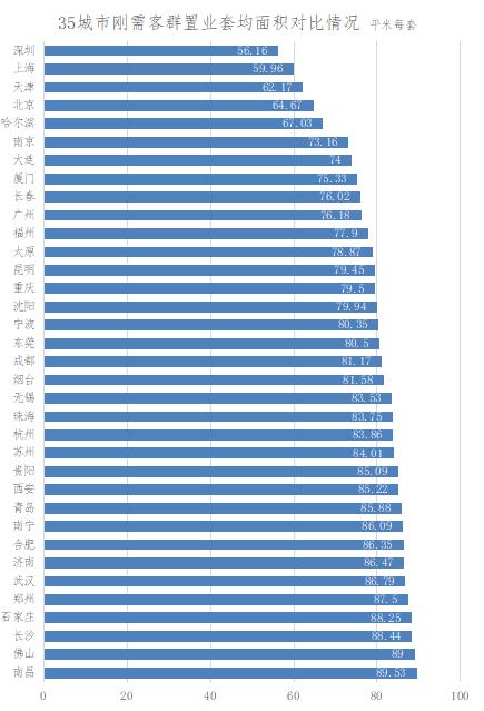 置业面积方面,2021年35个样本城市间刚需“上车”套均面积差异依然显著,城市能级间差距依旧明显。城市刚需“上车”面积出现差异性,很大程度上与购房负担、住房供给结构以及消费习惯等因素有关。深圳、上海、天津及北京等城市刚需“上车”平均面积较小,一方面是因为所在城市居住负担较大,另一方面则是这些城市住房供给以小户型房源为主导,以深圳为例,在售房源中近64%集中在90平以下面积段,整体住房市场结构偏向小面积房源。一线城市刚需置业套均面积从小到大排名为“深上北广”,与2020年的“上北深广”相比,在排名上出现了变化,4个一线城市平均住房面积约为62.31平。15个新一线城市中,居住面积较低的城市为天津、南京及重庆,居住面积较大的城市为佛山、长沙及郑州,15个新一线城市的居住面积均值约为83.86平,与2020年15个新一线城市85.66相比,下降约1.8平。16个二线城市中,居住面积较小的城市为哈尔滨、大连及厦门,居住面积较大的城市为南昌、石家庄,16个二线城市的居住面积82.56平,与2020年11个二线城市84.83相比,下降约2.27平。