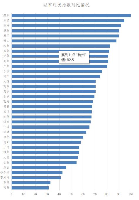 在纳入统计的35个样本城市中,深圳、珠海、东莞及佛山等粤港澳大湾区城市成为典型的“迁徙”城市,苏州、杭州及无锡等长三角城市紧随其后,此外,厦门及成都的迁徙指数排名也相对靠前。
