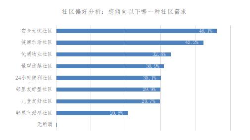 刚需客群倾向于什么样的社区?调研数据显示,63.8%刚需样本户家庭倾向于选择中等规模社区,22.5%表示倾向于选择大型社区,11.5%表示倾向于小型社区,只有2.2%表示会选择超大规模社区。46.1%的刚需样本户家庭表示更倾向于选择安全无忧型社区,即在居住体验方面安全舒心,监控、防护措施到位,安全性较高;42.2%的刚需样本户家庭表示更倾向于选择健康乐活社区,即社区功能丰富,家庭成员都有各自喜欢的活动空间,乐活无忧;32.8%的刚需样本户家庭表示更倾向于选择优质物业社区,即社区可提供多项物业增值服务等。