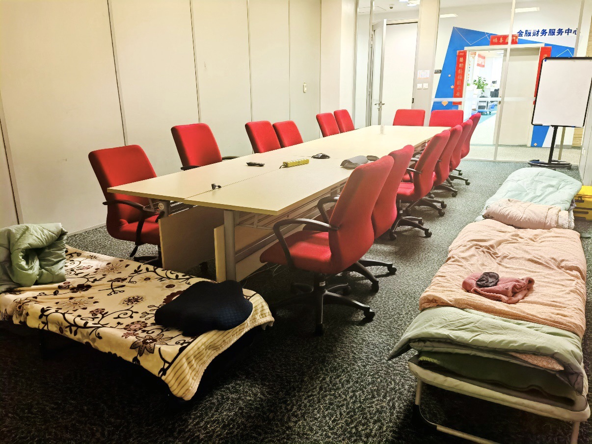 作为平安集团的财务共享枢纽,金服财务服务中心承担着全集团费用报销、资金管理、总账处理、纳税申报等业务,为保障专业公司各类资金及时、安全支付,保障月度、季度结算平稳运行,金服组建了一支由6人组成的特殊保障小分队,他们于封控前夜重返职场,把“行军床”扎在了会议室,转眼间已经60天。