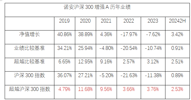【诺安沪深300指数增强基金】本基金成立于2018.8.22,由原诺安上证新兴产业交易型开放式指数证券投资基金联接基金转型而来。2018.8.22至2023.6.2,梅律吾担任基金经理;2019.3.2至2023.9.5,宋德舜担任基金经理;2023.6.3至今,孔宪政担任基金经理。自2020.10.28起,本基金分设A、C两类份额;自2024年1月30日起,本基金设立D份额。A类2019-2023年净值增长率分别为:40.86%、38.89%、4.36%、-17.97%、-7.62%,同期业绩比较基准收益率分别为: 34.21%、25.94%、-4.80%、-20.54%、-10.74%;C类2021-2023年净值增长率分别为: 3.97%、-18.30%、-7.98%,同期业绩比较基准收益率分别为: -4.80%、-20.54%、-10.74%。(数据来源:诺安沪深300指数增强型证券投资基金定期报告;本基金的业绩比较基准为沪深300指数收益率×95%+一年期银行储蓄存款利率(税后)×5%)