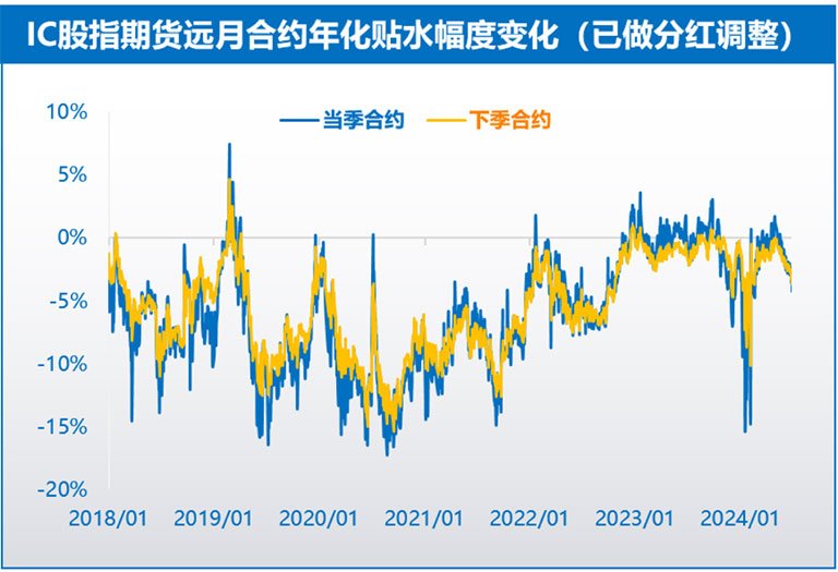 国内量化对冲公募基金发展的痛点,就在于负基差在国内股指期货市场一度是较长时期的存在。2015-2018年期间,由于政策制约,国内股指期货市场出现了较长时间的深度贴水。2019年4月国内股指期货限制基本放开,期指持仓情况逐渐修复并创新高。2022年股指期货对冲成本高时,沪深300股指期货(即IF合约)和中证500股指期货(即IC合约)年化贴水甚至可达-10%(股指期货升水/贴水可以看成是正基差/负基差的相对百分比表达形式,升水率/贴水率=基差÷股指期货标的指数现货价格×100%);2023年,国内股指期货贴水情况开始逐渐修复,但不同品种之间波动差异较大。这就导致在此前多年的时间里,国内的量化对冲公募基金一度很难通过指数增强多头策略的回报来完全对冲负基差居高不下带来的成本,甚至导致量化对冲公募基金出现阶段性负收益的情况。大家可从下图观察国内股指期货贴水的历史变化情况: