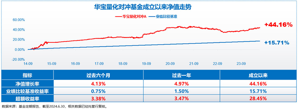 有效的投资策略制订和执行,为华宝量化对冲基金获得长期相对稳健的业绩奠定了基础。截至2024年6月末,该基金自2014年9月17日成立以来累计净值增长达44.16%,相对业绩比较基准超额收益率达28.45%;该基金最近1年累计净值增长达4.97%,排名同类基金产品第2位(2/23)。截至2024年6月末,华宝量化对冲基金最近1年风险收益比突出,其最大回撤仅-1.40%,亦排名同类基金产品第2位(2/23);同期其卡玛比率达3.54,排名同类基金产品第1位(1/23)(卡玛比率=区间年化收益率/最大回撤,该比率越大表明风险收益比越高,更好地兼顾了收益与风险平衡)。通过分月数据统计亦可见,截至2024年6月末,华宝量化对冲基金在成立以来的121个月中,实现月度正收益的概率接近70%。