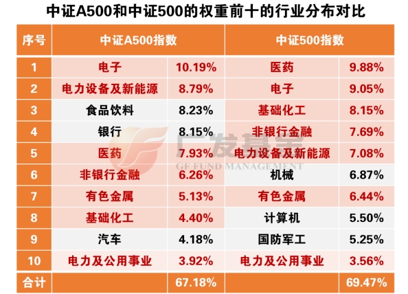 从前十大权重的行业分布看,中证A500和中证500指数差别并不是很大,累计权重分别为67%和69%,而且有7个行业是重合的。