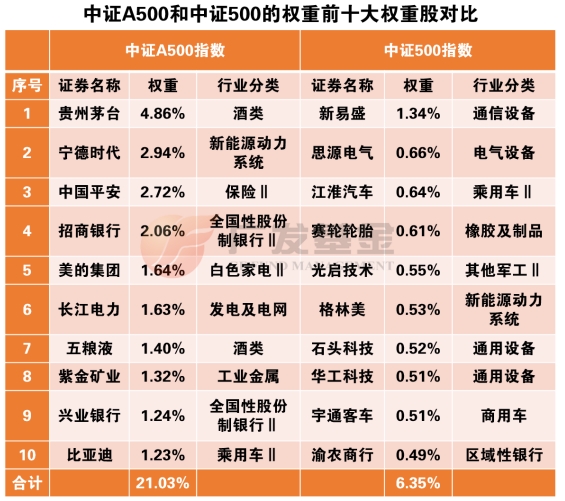 中证A500和中证500两只指数前十大权重股的差别就很大了,不仅没有重合部分,而且累计权重出现明显差距。