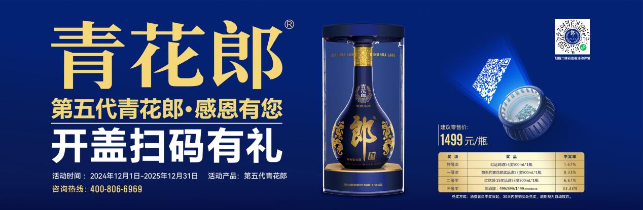 凡通过线下渠道购买并开启第五代青花郎的消费者,只需扫描瓶盖上的二维码,即有机会抽取特等奖红运郎酒、第五代青花郎、红花郎·15等大奖。