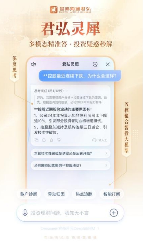 探索AI前沿应用,数智赋能体验升级。国泰海通全面提升大模型服务能力,推出1+N模型聚合体“君弘灵犀大模型”,并首创融入君弘智投数字化服务体系,打造证券行业特色的大模型应用微场景,推动AI技术与证券行业应用场景深度融合,构建证券垂类大模型沉浸式服务闭环,打造AI盯盘服务、交互式AI解读、视频直播陪伴、智能导航交易下单等多元交互模式,全面提升用户体验。打造AI投教游戏,开创互动新玩法。2025国泰海通财富领航活动创新投教形式,结合DeepSeek等AI生成式大模型,推出由专业投顾和AI智能机器人进行观点PK的投教游戏,用户参与活动体验AI技术应用,切实增强用户参与感和获得感,数智赋能重构服务体验。
