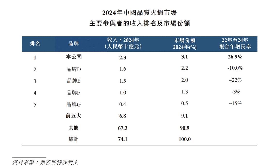 巴奴是中国品质火锅市场的绝对领导者。根据弗若斯特沙利文的资料,巴奴是中国品质火锅市场中按收入计的最大火锅品牌,于2024年占据了3.1%的中国品质火锅市场份额。 巴奴的增长潜力,一方面来自于品质火锅赛道的持续扩容。基于此,巴奴也实现了每年20%以上的稳健开店增速。近期,在巴奴官方发布了下半年几十家的拓店计划,粉丝们的开店呼声热烈,也侧面说明了巴奴目前的市场品牌热度非常高。