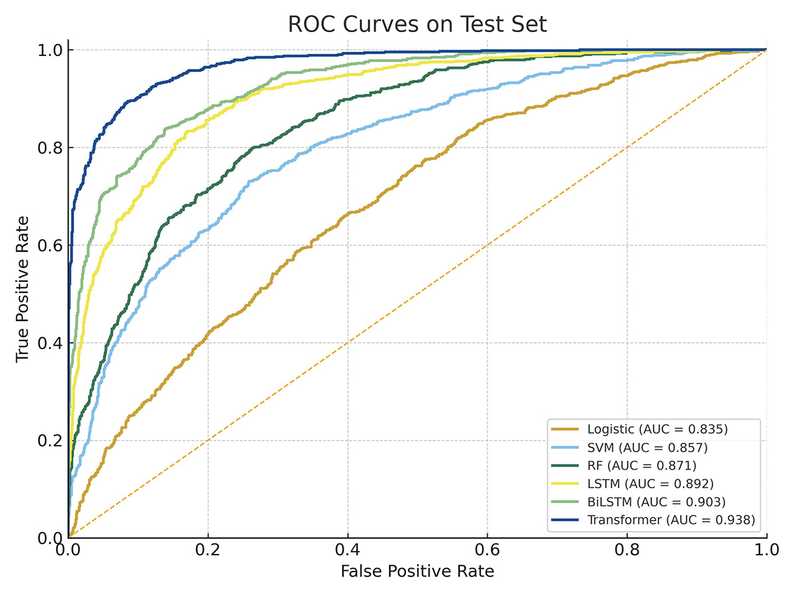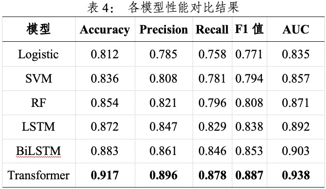 为验证模型的有效性,本研究对比了多种主流分类算法,包括传统机器学习模型Logistic回归、支持向量机(SVM)、随机森林(Random Forest,RF)与深度学习模型LSTM、BiLSTM以及Transformer。模型在测试集上的性能结果如表4所示。