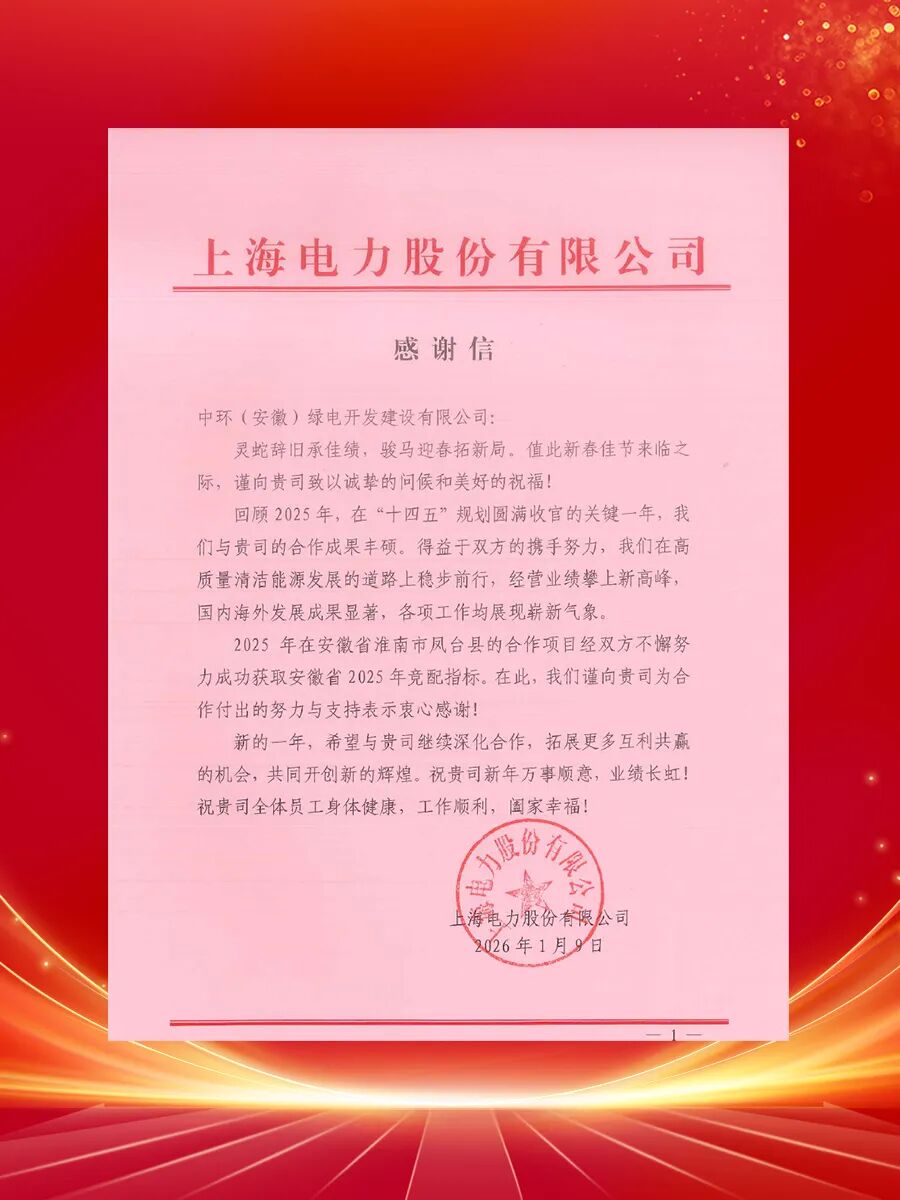 国家电投上海电力股份有限公司感谢信 图片来源:中环绿电