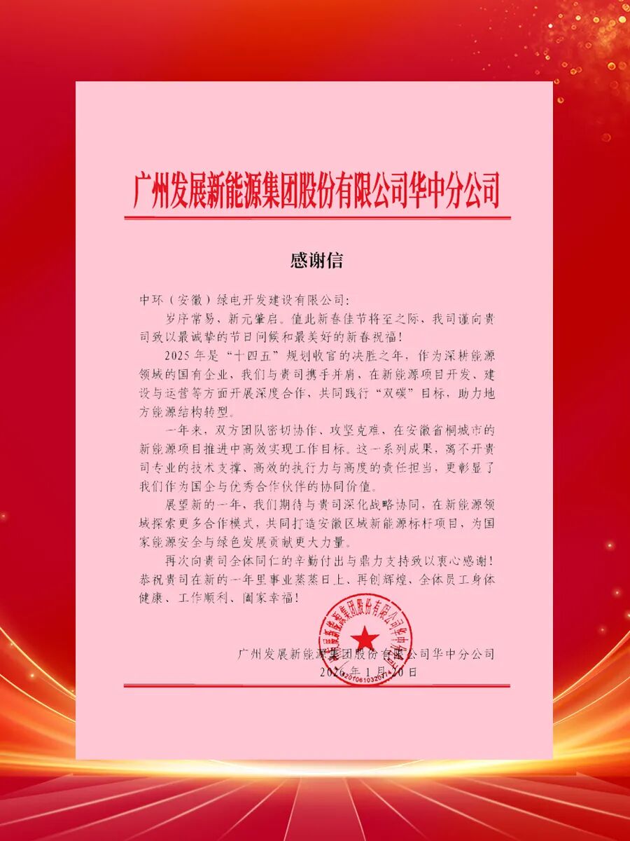 广州发展新能源集团股份有限公司华中分公司感谢信 图片来源:中环绿电