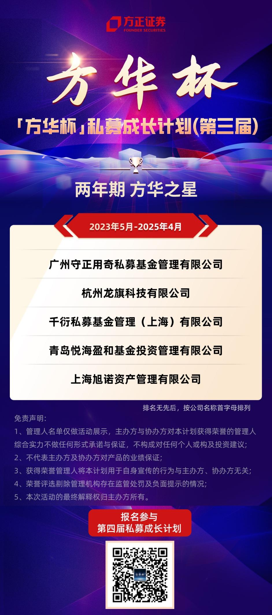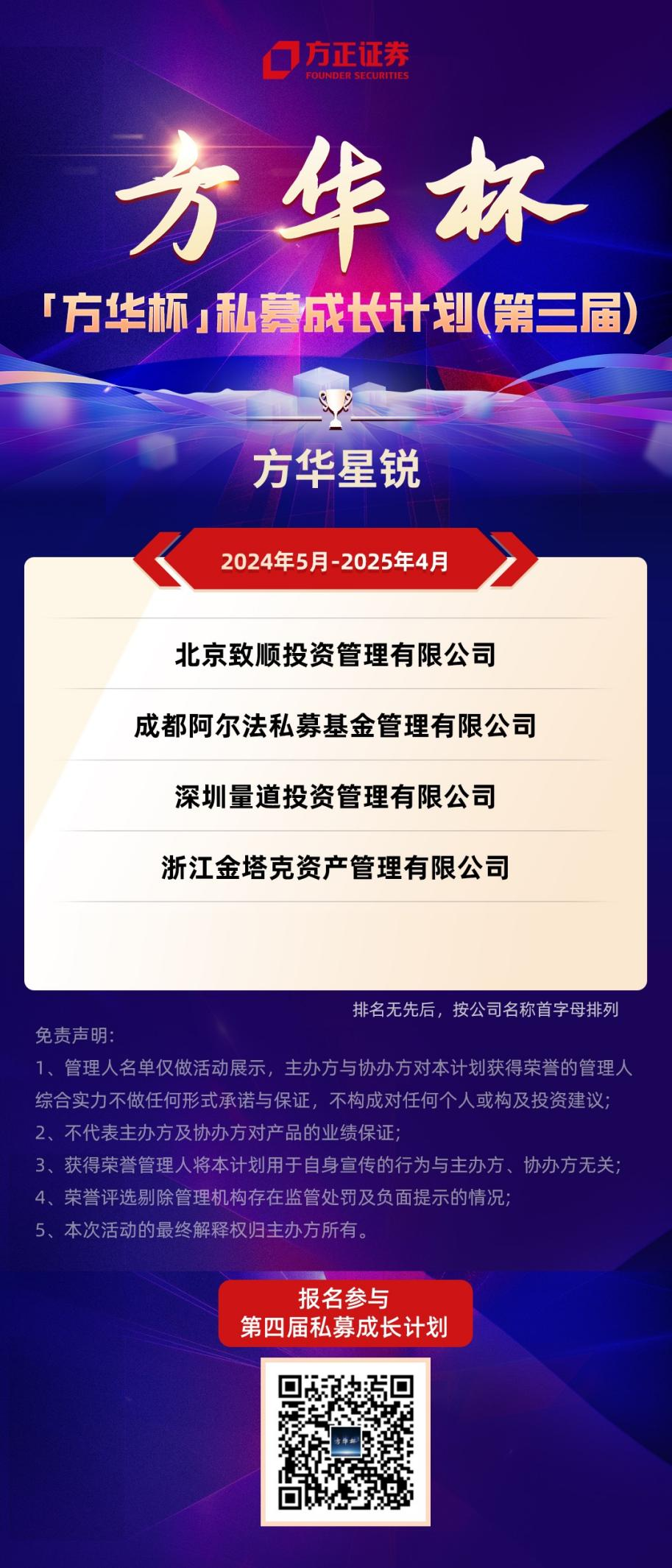 “方华杯”私募成长计划作为方正证券践行机构赋能使命的核心活动品牌,不仅为私募管理人提供展示实力与荣誉评选平台,更通过多层次资金对接、专业系统支持、优质投研及品牌宣传等权益,助力优秀管理人突破成长瓶颈,实现可持续发展。(CIS)
