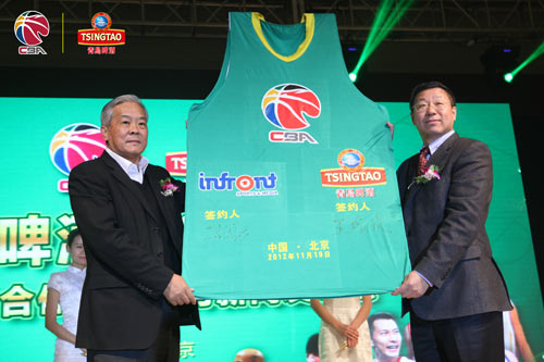 作为世界最知名的中国啤酒品牌,青岛啤酒与国际一流赛事平台CBA联赛签订合作协议,这是一次顶级品牌间的强强联合。在签约仪式上,盈方中国总裁马国力与青岛啤酒副总裁兼营销总裁王瑞永共同在印有“青岛啤酒?CBA:2012-2013年”字样的超大号球衣上签名,这象征着青岛啤酒将作为一名战士加盟到中国CBA联赛新赛季的激情大战中。