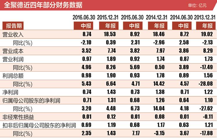 全聚德半年财报业绩显示,2016上半年,该公司实现营业收入8.74亿元,同比下降2.10%;实现利润总额9807.02万元,同比上升5.43%;归属于母公司所有者的净利润为7066.69万元,同比上升3.20%;基本每股收益为0.2291元,同比上升3.20%;接待宾客357.76万人次,同比增长4.84%。