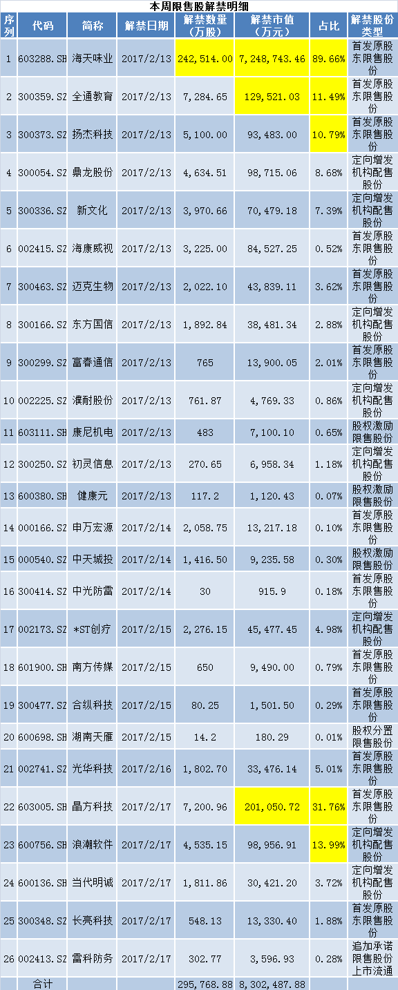 根据公告显示,海天味业2月13日有24.25亿股限售股上市流通,占总股本比例89.66%,为首发限售股上市。
