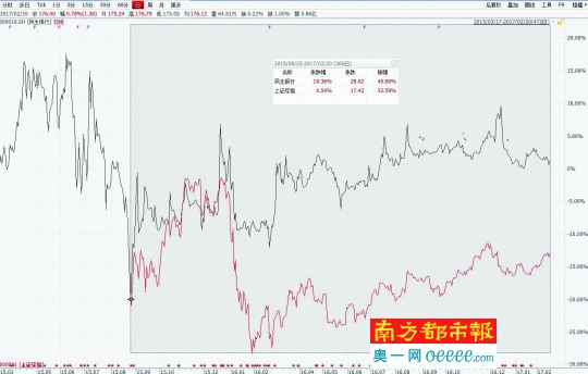 2015年8月25日至20 17年2月20日,民生银行股价上涨19.36%,明显强于上证综指。注:红色线为上证综指日K线,黑色线为民生银行日K线(用后复权统计)。