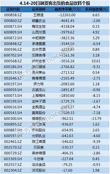 比如食品饮料行业中,净卖出额靠前的绝大多数是白酒龙头股,比如排名第一的五粮液,遭融资客净卖出1.23亿元;贵州茅台遭融资客净卖出2700万元;顺鑫农业、山西汾酒、古井贡酒、沱牌舍得、泸州老窖等多只白酒股也遭融资客净卖出;