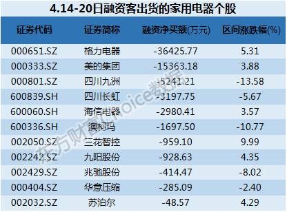 家电板块方面,龙头股遭融资客出货的迹象更为明显,格力电器和美的集团净卖出额列第一和第二,分别遭净卖出3.64亿元和1.54亿元;另外海信电器、九阳股份、苏泊尔等家电龙头也遭净卖出。