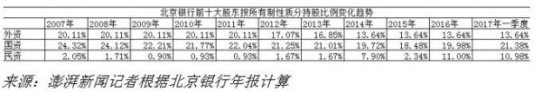 虽然上市十年来,北京银行始终不存在控股股东和实际控制人,但北京银行前三大股东荷兰ING BANK N.V.(ING银行)、北京市国有资产经营有限责任公司(国资公司)、北京能源投资(集团)有限公司(京能集团)格局基本稳定,同时三家股东十年来均未曾减持北京银行股票。
