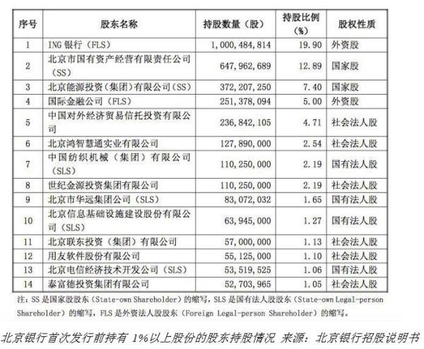 根据北京银行首次公开发行股票说明书,IPO前持有北京银行股份比例超过1%的股东,有ING银行、国资公司、京能集团、国际金融公司、中国对外经济贸易信托投资有限公司(外贸信托)、北京鸿智慧通实业有限公司(北京鸿智慧通)、中国纺织机械(集团)有限公司(中国纺机)、世纪金源投资集团有限公司(世纪金源)、北京市华远集团公司(华远集团)、北京信息基础设施建设股份有限公司(北信基础)、北京联东投资(集团)有限公司(联东集团)、用友软件股份有限公司(用友软件)、北京电信经济技术开发公司(北京电信).
