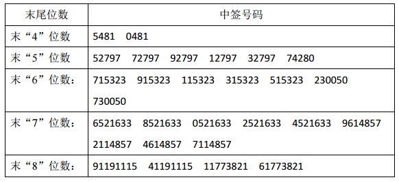 凡参与本次网上定价发行的投资者持有的申购配号尾数与上述号码相同的,则为中签号码。中签号码共有48,600个,每个中签号码只能认购500股江苏大烨智能电气股份有限公司A股股票。