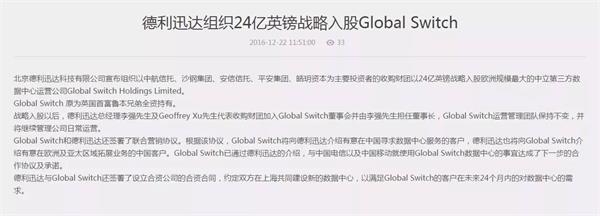 2016年底,德利迅达总经理李强组织以沙钢集团、中航信托等为主要投资者的中资财团Elegant Jubilee,通过24亿英镑(约合206.064亿元人民币)收购了Global Switch(以下简称GS)49%的股份,且Elegant Jubilee拥有GS另外2%股权的购买期权,行权价格为2英镑。该购买期权行权后,苏州卿峰将通过EJ持有GS51%股权,将GS纳入合并范围。